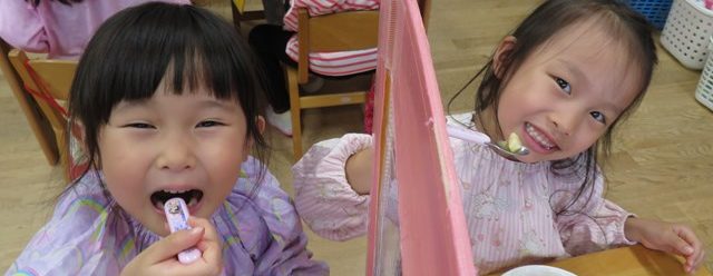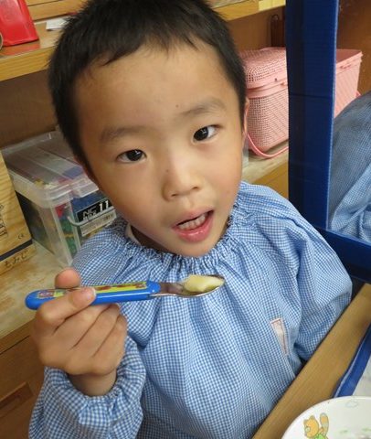 「リンゴの味は、どうだった?」とたずねると、「おいしくってね、おかわりしたよ。」とお話してくれました。3年間過ごしてきた幼稚園で、みんなと同じように育ったりんごの味。