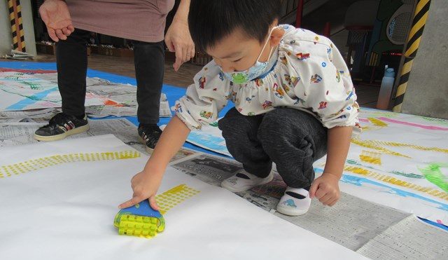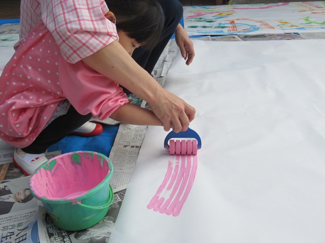 まずは、年少組さんが中心になって、ローラーを転がしていきます。黄色のなが~い道の上を、黄緑さんが通っていったり、ピンクの道路に合体したり・・・