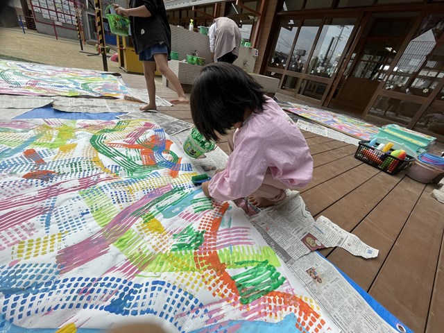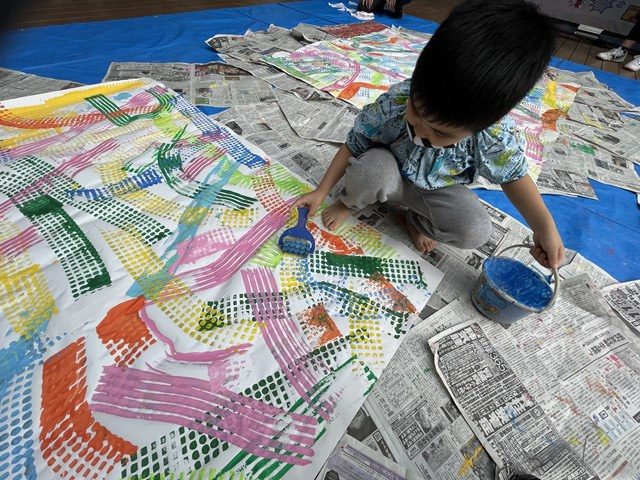 年少組さんが塗り切れなかった端っこや真ん中の空白部分を、裸足になって移動しながら埋めていってくれました😊