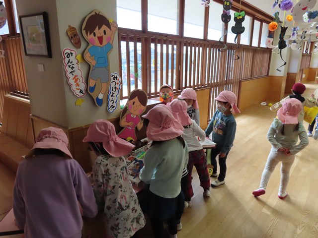 10月31日(月)、年中組は久しぶりのお出かけの日です。朝、2階にあがると、先生たちのサプライズ!