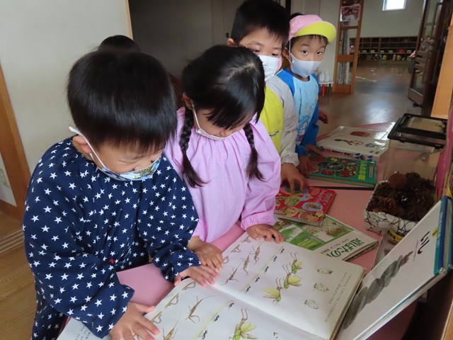 さて、降園時間。教務課の前の図鑑コーナーから子ども達のお話が聞こえてきたよ。