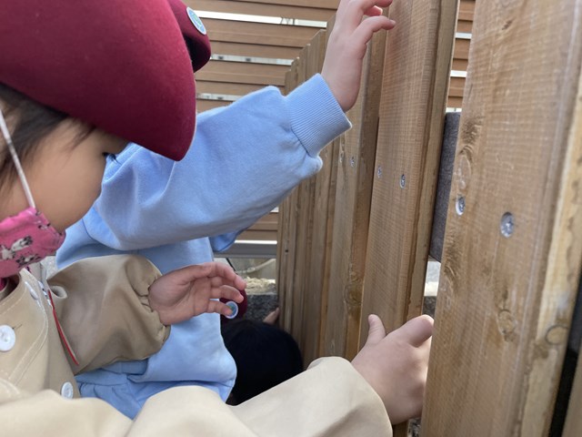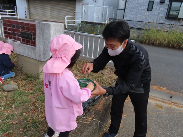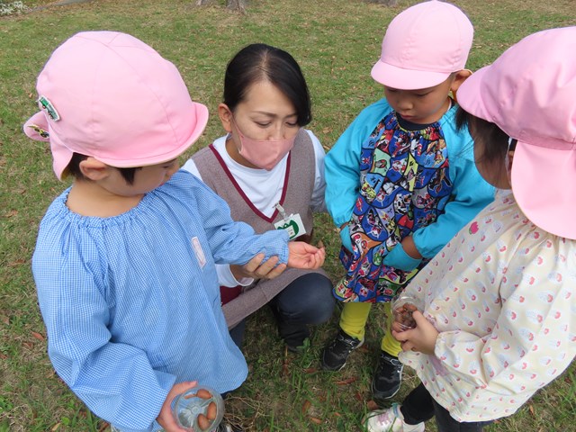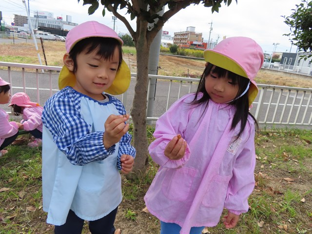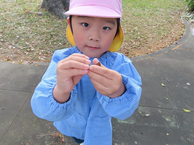 りょうちゃんが拾ったピカピカのどんぐりを見せてくれたり、「これ、ゆうまくんが見つけてくれたんだ~!」と、友達が見つけてくれた黒い幼虫を大切そうに持ってきたゆうとくん。