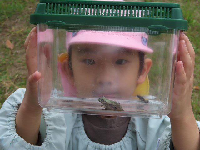 場所が決まったので、カエルたちを捕まえた、のんちゃんが逃がしてあげることになりました。