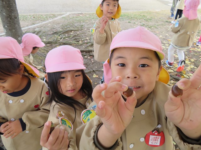 見てみて!こないだの宇佐南公園のどんぐりとは、ちょっと違うなぁ・・・。こっちは、ま~るくて、茶色いよ!