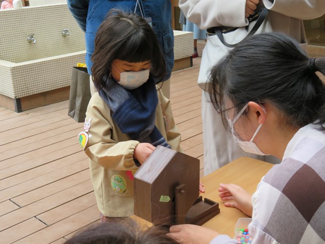 がらがらがら・・・ぽんっ!と飛び出した玉の色でお菓子がもらえたね。子ども達はみんな、真剣なお顔で、どきどきしながら回します。