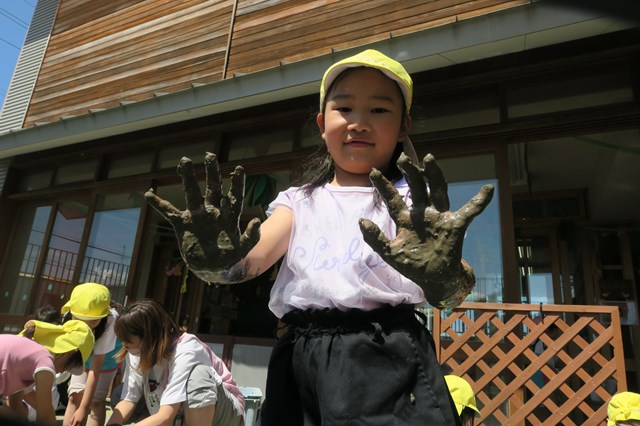 みんなは「どろどろしてる~手がこんな風になったよ!」泥の感触を楽しんでいたね😊