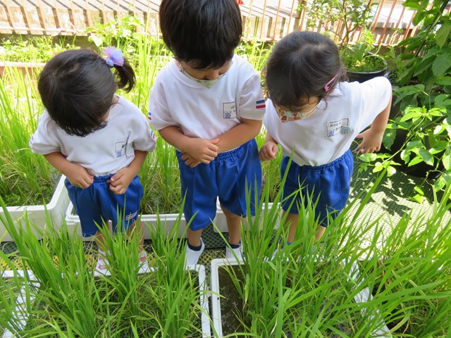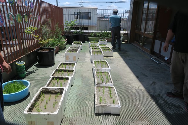 7月、暑い夏。ぐんぐん成長した苗を、年少組や年中組さんも見に来たよ。