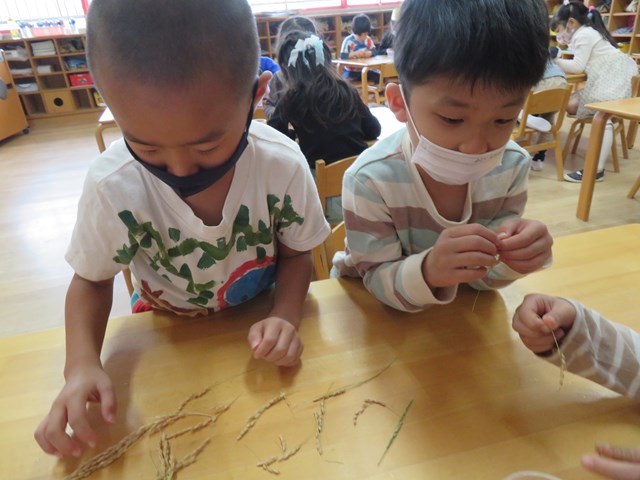 幼稚園のみんなで、米粒を稲からバラバラにする作業をしたね。
