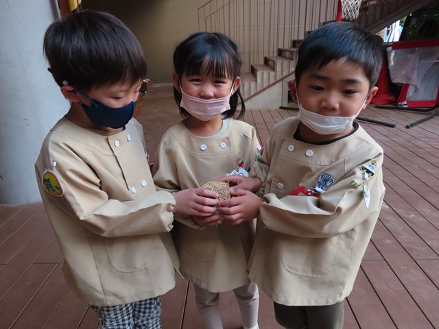 収穫した新米の🍙の形は、ハートだったり、三角だったり・・・みんなは大盛り上がり😊