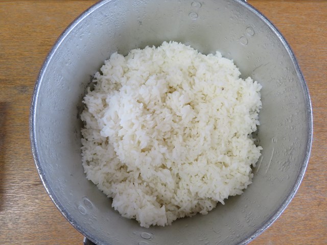調理員さんが、炊き立ての白米を年長組の各クラスに届けてくれました。う~ん、いいにおい!