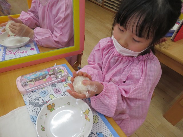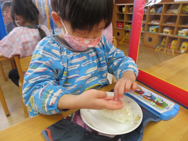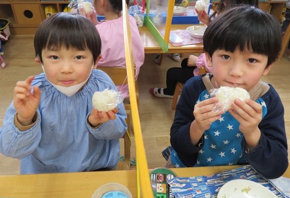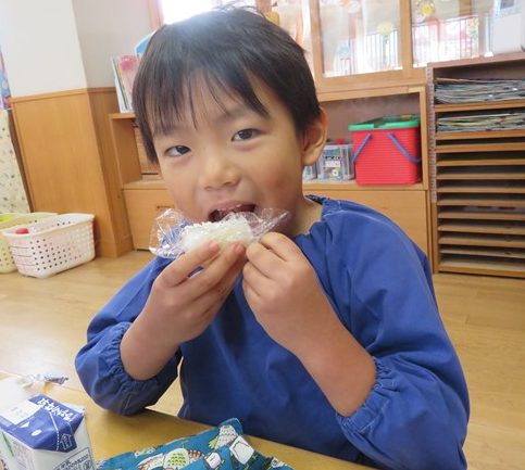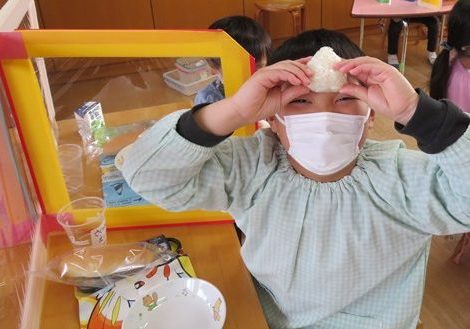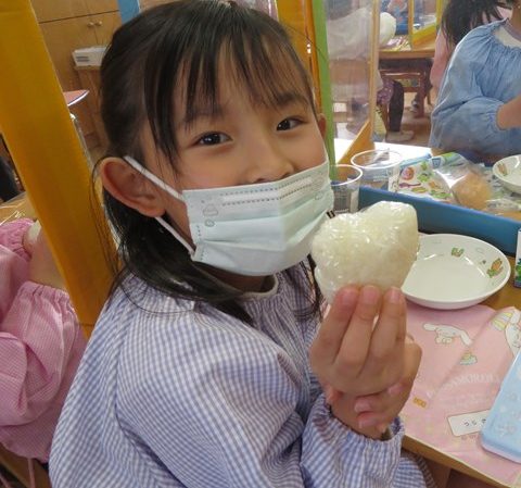 大きな大きなまん丸おにぎり。お友達と「こんな風にお米になったんだね」「ぼくたちが作ったお米、ピカピカだね!」