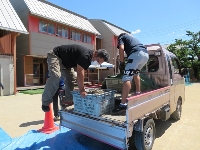 トラックで運ばれてきた沢山の、重い重い田んぼの土。ここからが稲作りの始まりだったね。