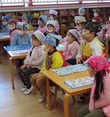 さて、年長組のみんなも三角巾を頭に被って準備していますよ。(急なお願いにご協力を頂きまして本当にありがとうございました。)