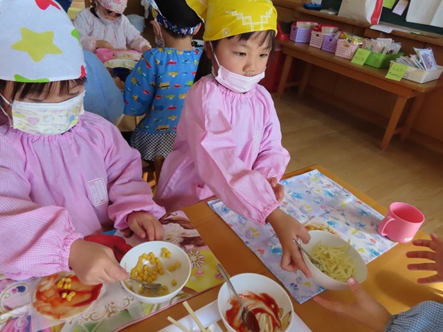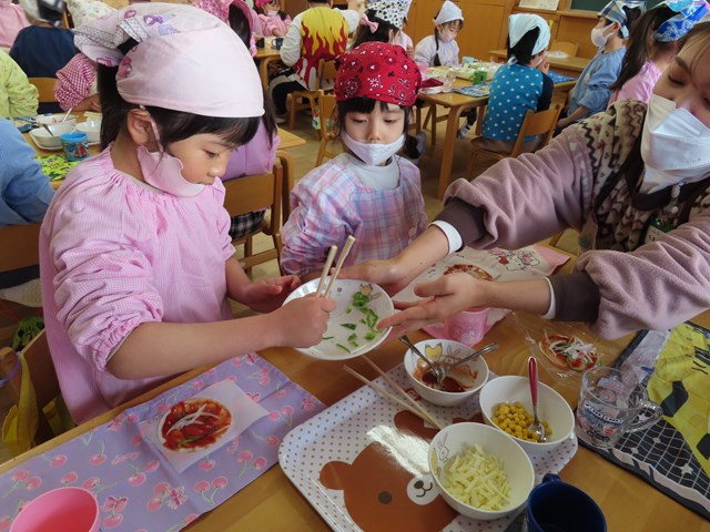 材料が運ばれてくると、子ども達は、早くトッピングしたくてうずうずしている様子。