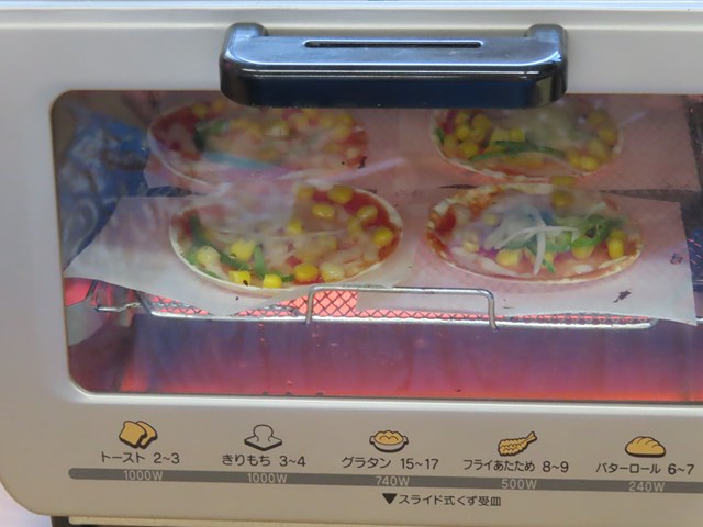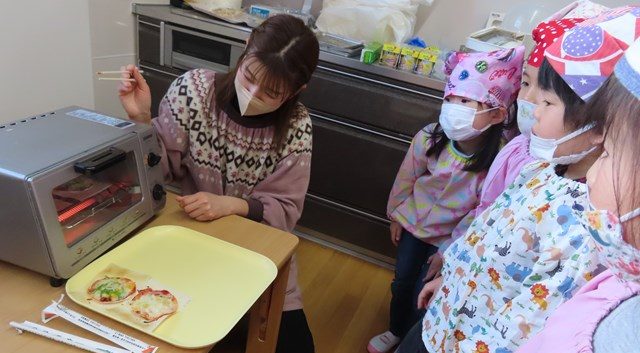 トースターの中に入るとあっという間に簡単にできちゃうピザを、夢中で見つめていた子ども達。