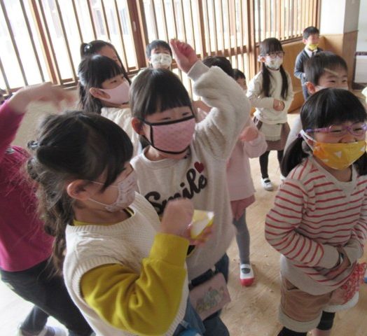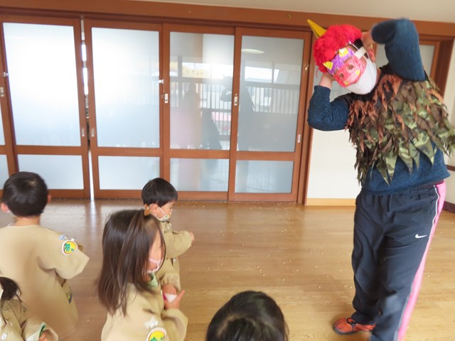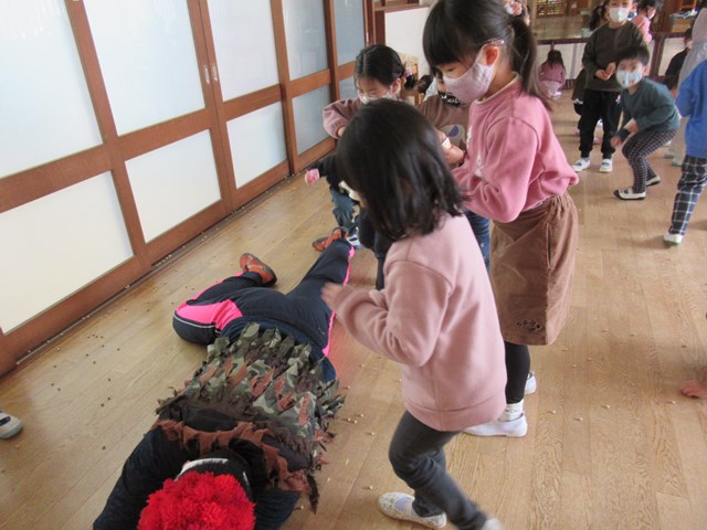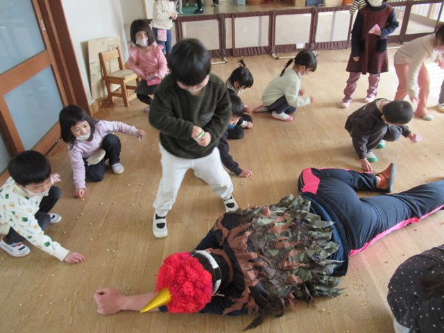 と思ったら,子どもたちは「あっはははは!」と大笑い😊そして豆をどんどん投げましたよ。