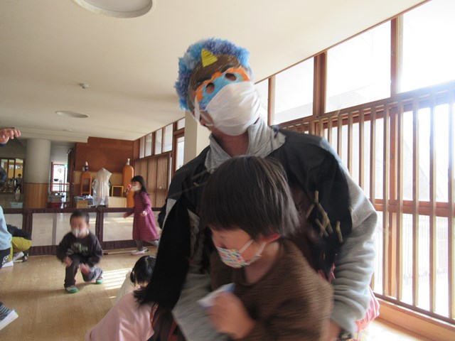 しかし、鬼を見た瞬間にひるんだ子も。「鬼は外~」の声はかすれ気味の小さな声。。。