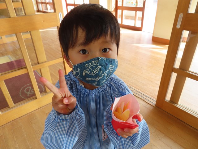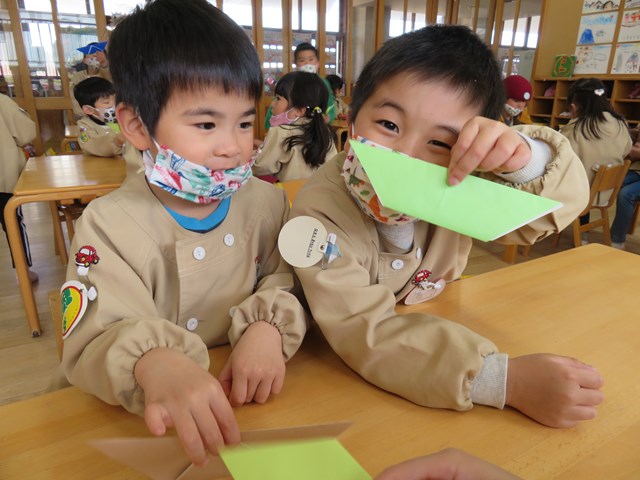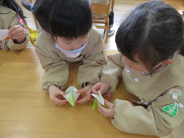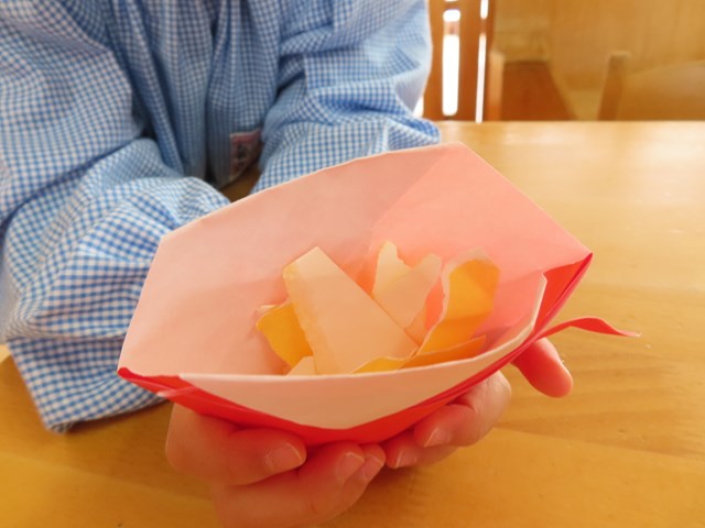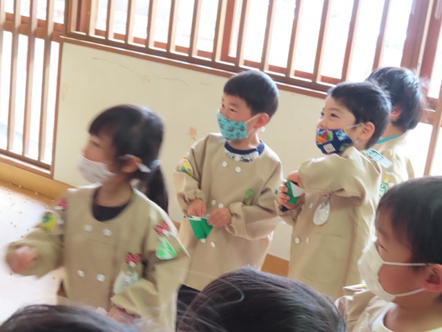 まずは、全員が、豆を入れるコップを折り紙で作りました。年中、年長組は今までの折り紙制作の経験から簡単に折りましたが、年少組さんはちょっぴり苦労しながらも最後まで自分で作りました😊