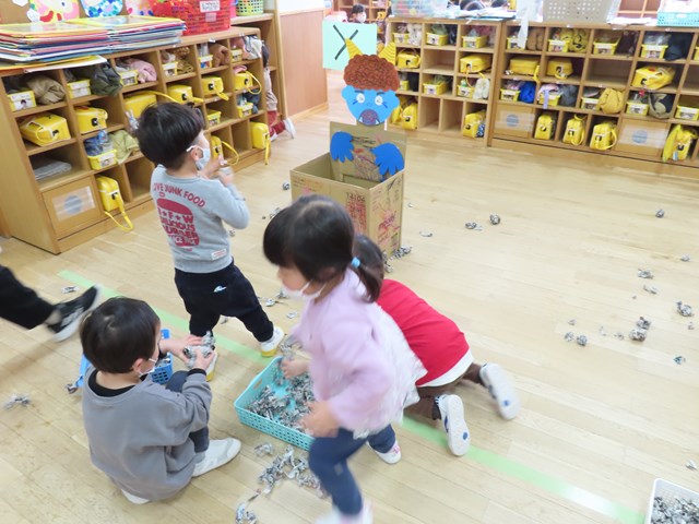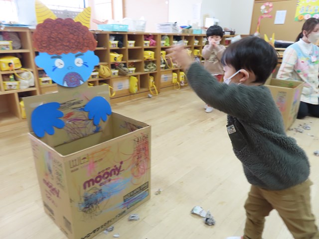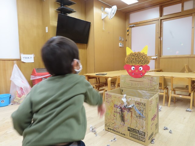 さあ、いよいよ豆まきに挑戦!まだまだ小さなみんなですので、先生たちは安全に楽しむため、新聞紙を丸めた「大きめのお豆」を子ども達とつくりました。