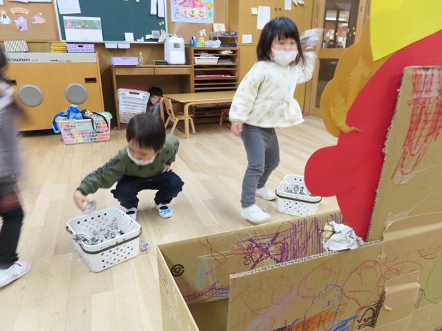 新聞紙の豆を思いっきり投げて、おなかのポケットに入ると、「やったー!!」