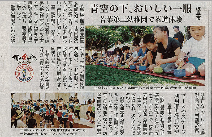 表千家の日比野宗悠先生の温かいご指導のもとで、心をわくわくさせながら、真剣な表情でお茶を点てている様子を、新聞社の方が撮影してくださいましたのでご紹介します。