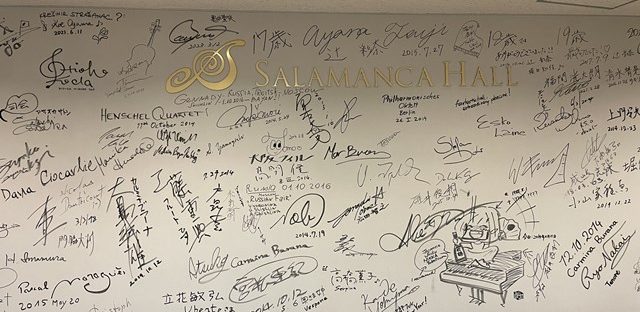 舞台袖の壁一面、これまで演奏された音楽家の方々のサインで埋め尽くされています。