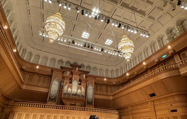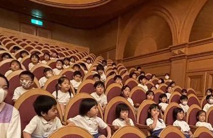 さあ、若葉第2、第3幼稚園の子ども達が一人ずつ席につきました。天井の煌びやかなシャンデリアや荘厳と佇む大きなパイプオルガンに、釘付けになって見入っていましたよ。