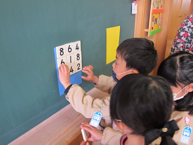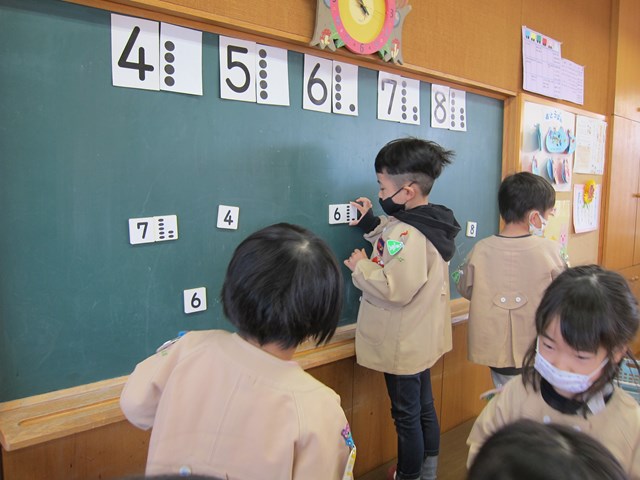 今回は、言葉カードでたくさん遊びながら学んだあと、「4~8の数字」に取り組みました。一つ一つの●の数を慎重に数え、黒板の数字の下に貼っていく子ども達。