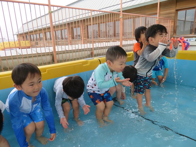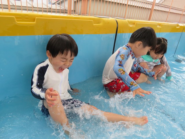 昨年、満三歳児クラスのちゅうりっぷ組だった子ども達にとっては、やっと『大きな黄色いプール』に入れてうれしそう😊