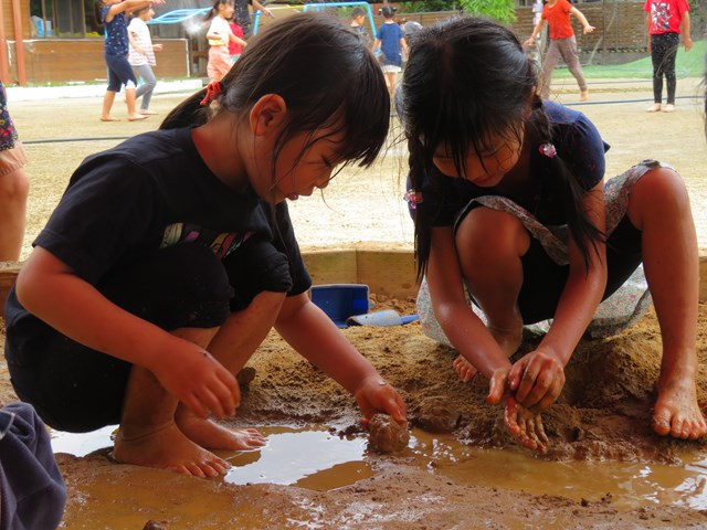 子ども達の働きかけや遊びを通して、水を混ぜると柔らかくなり乾けば固くなる、といった泥の可塑性や、独特の感触、天候による泥の温度の変化など、様々なことを体感することで、感じる力が育っていきます。匂いを嗅いでいる子もいましたよ。