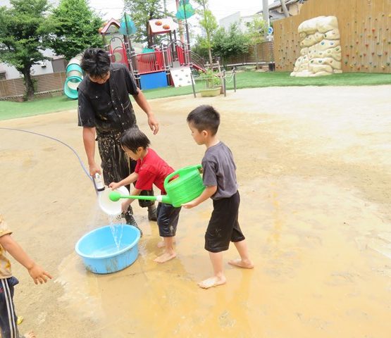 熱中症だけは避けたい為、毎日WBGT測定器で「暑さ指数」を測り、実際に職員が外に出て体感してみて、その日の遊び方を決めています。涼しい風があれば、少しの時間でも園庭で遊ばせてあげたいと思います。必ず水分補給タイムも取り入れながら。そして、汗でびしょびしょになって遊んでいる子ども達の様子を見守りながら・・・。