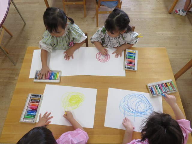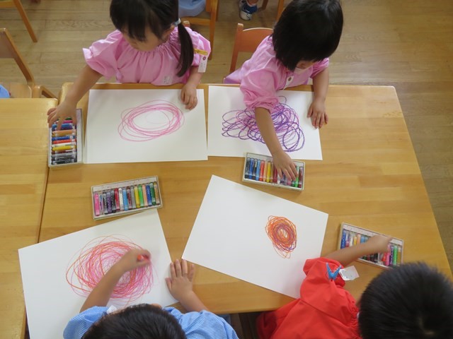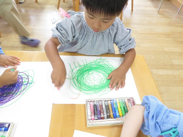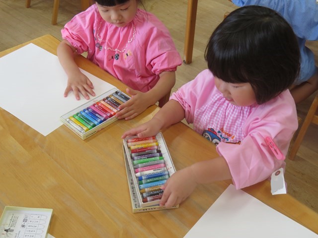 さあ、好きな色のクレヨンをひとつ持って赤!水色!紫・・・と自由にクレヨンを手にする子ども達。