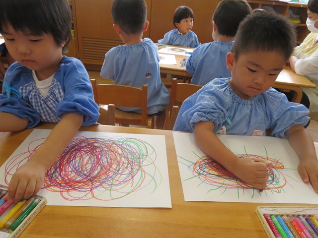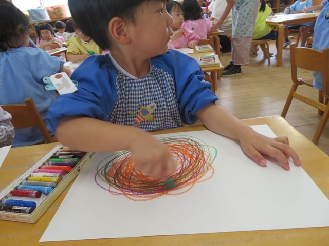 まずは、大きくスクリブルから!真っ白い画用紙の上を自由自在に、クレヨン達がすべります。