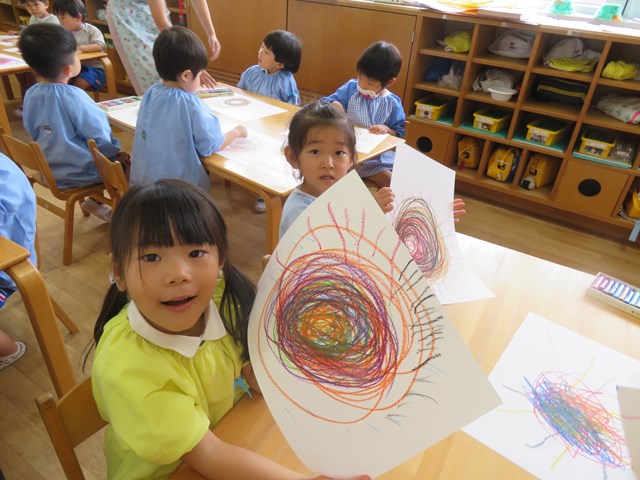 そこで、おさとう先生が、「クレヨンでこんなふうにぐるぐる~!っておひさまを描いてみよう!先生やってみるから見ていてね。」