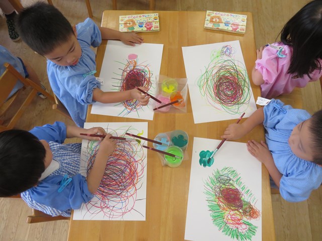 この日(7月10日)は年少組のアートタイム。子ども達が、初めて絵の具に出会う日でもありました。