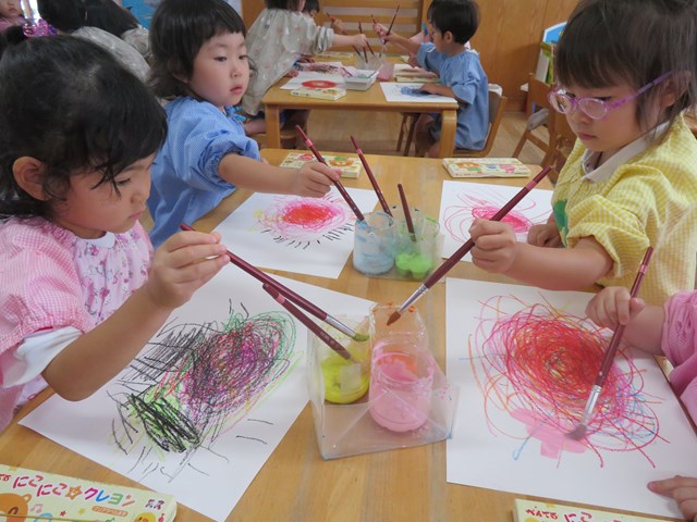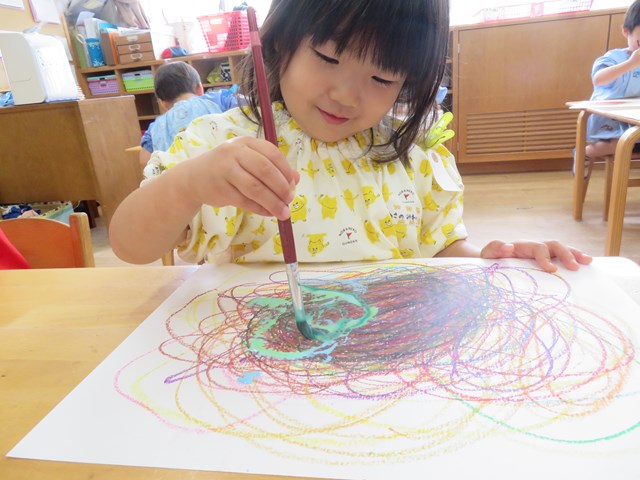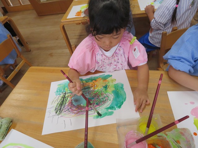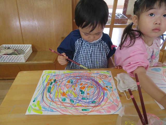 初めての絵の具の感触や色の広がり、交じり合った部分の美しさなどを目にして、自分の作品がどんどん色づいていく様子が嬉しくてたまらない子ども達の姿がそこにはありました。