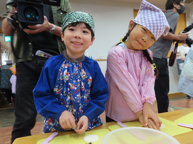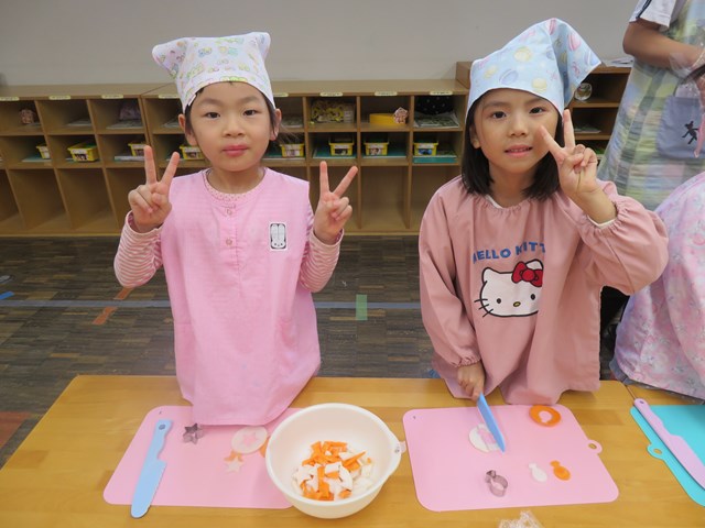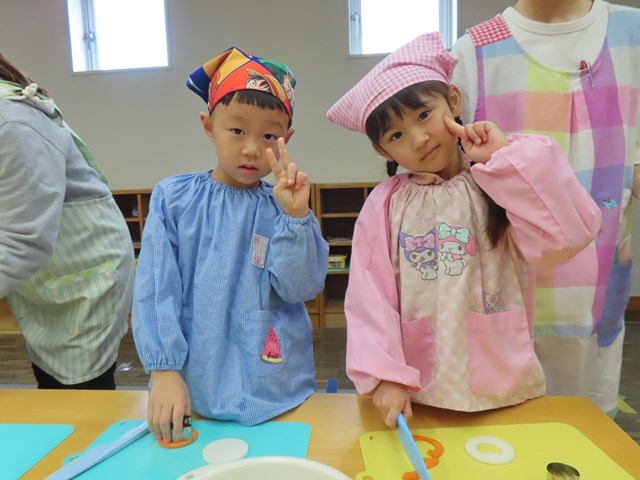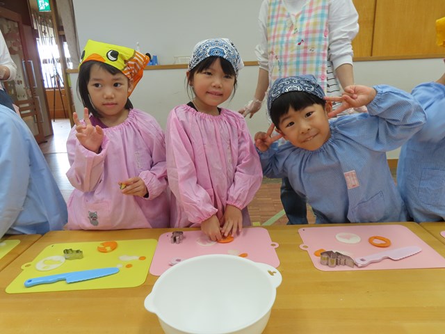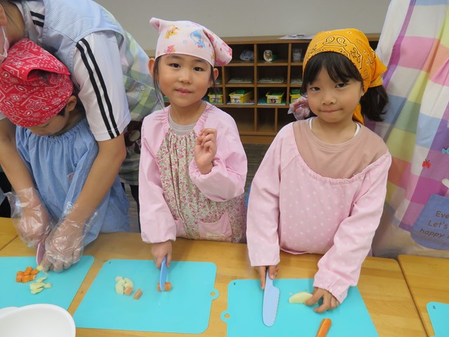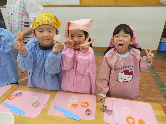 昨年もクッキング保育を行い、野菜の切込みを経験したみんな。今回はコンソメスープ用の型抜きや夕食の野菜の切込みに挑戦。
