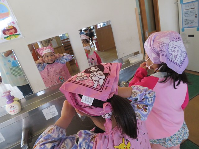 さあ、これから始まるクッキングの準備。三角巾をつけて、おちゃめなポーズ💕