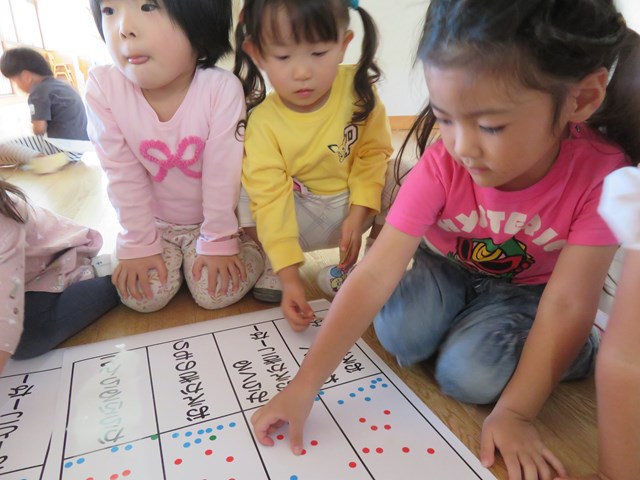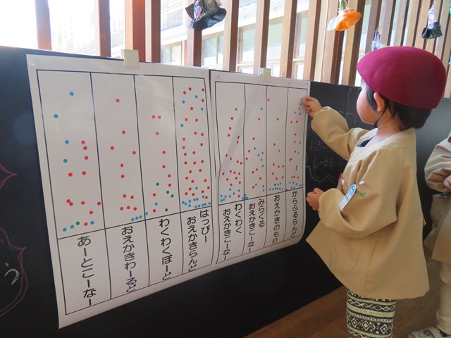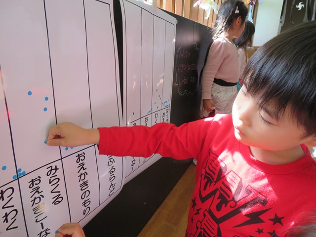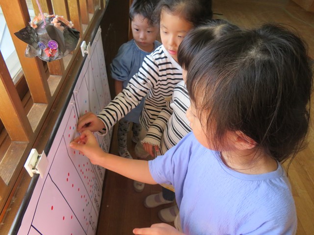 幼稚園全員の子ども達が順番に、自分の「いいな💗」と思った名前に、シールをひとつ貼っていきます。毎日どれが人気なのかが楽しみだった私たちです。