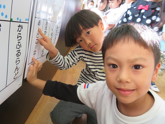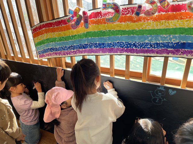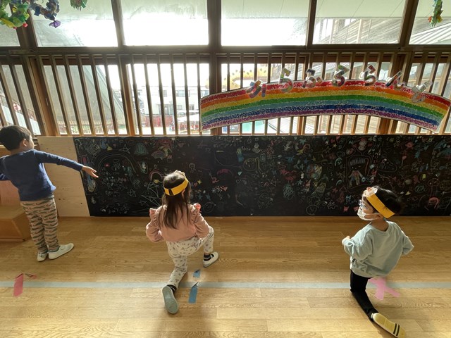二階のオープンスペースでダンスの練習をしている年中組さんも、にぎやかな落書きについつい目が行ってしまいます。