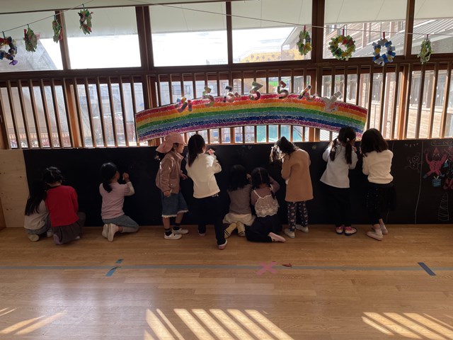 この虹は、年少組の子ども達が指スタンプで作ってくれました👉