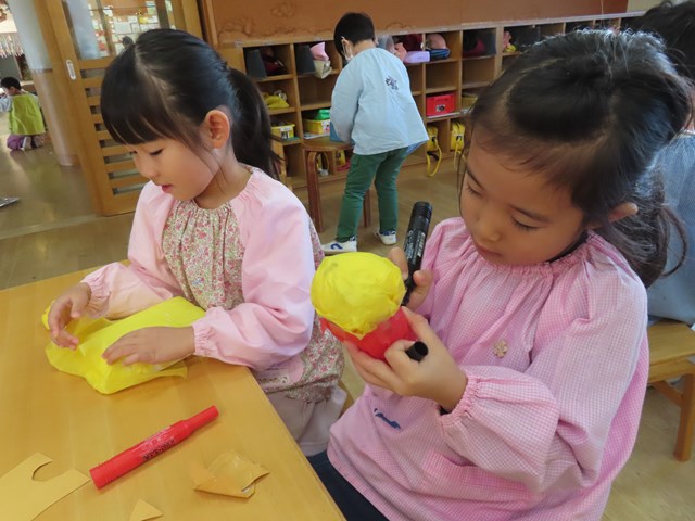 子ども達のアイデアには本当に驚かされますが、一つ一つの作品をみていると、先日のメモリーフェスティバルの年少組さんの歌声が胸をよぎります。