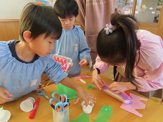 「うさぎ作りたいから、ピンクの画用紙で貼ろう!」