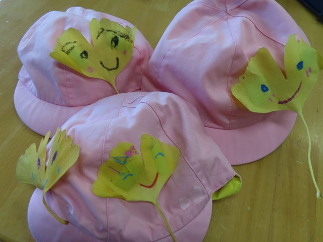 年長組さんは、拾うだけではなくこんな風にイチョウにお絵かきをしているんですよ😊