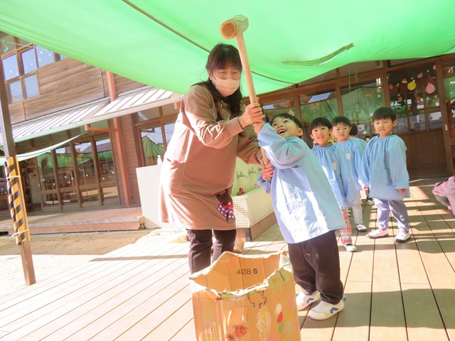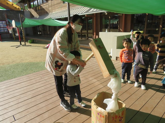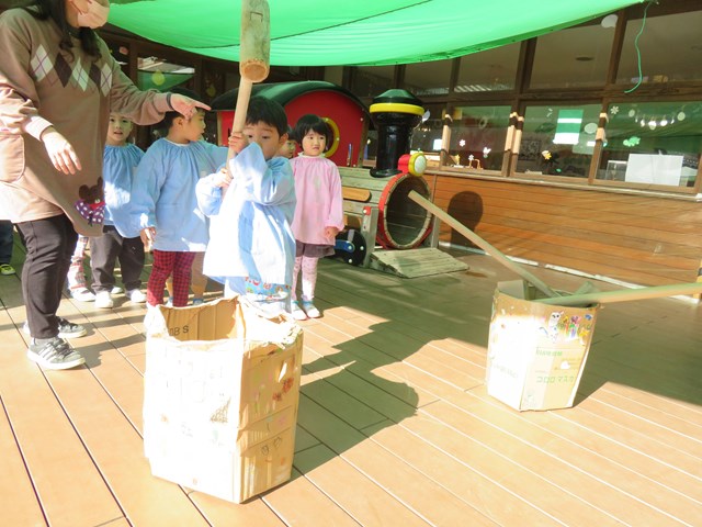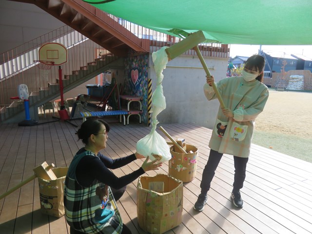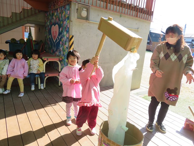 さて、先日の年中組に続いて、年少組さん達も『おもちつきごっこ』に挑戦!