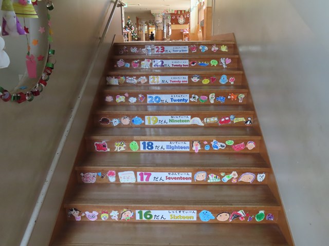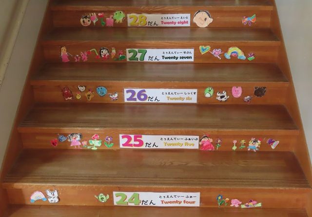 「年中組への階段の絵を新しくしよう!」ということで、子どもたち思い思いの絵がずらり😊