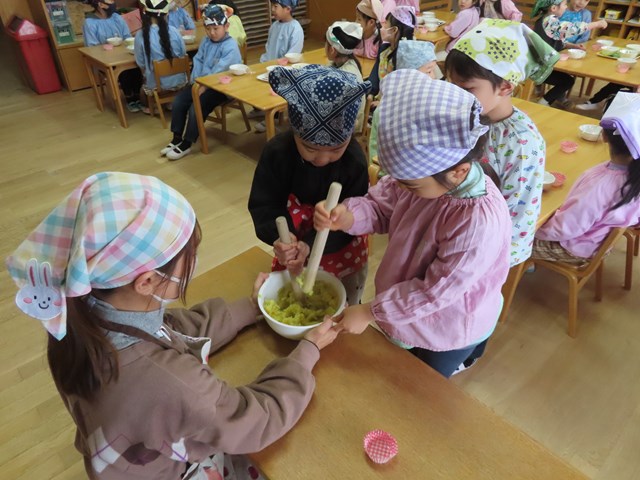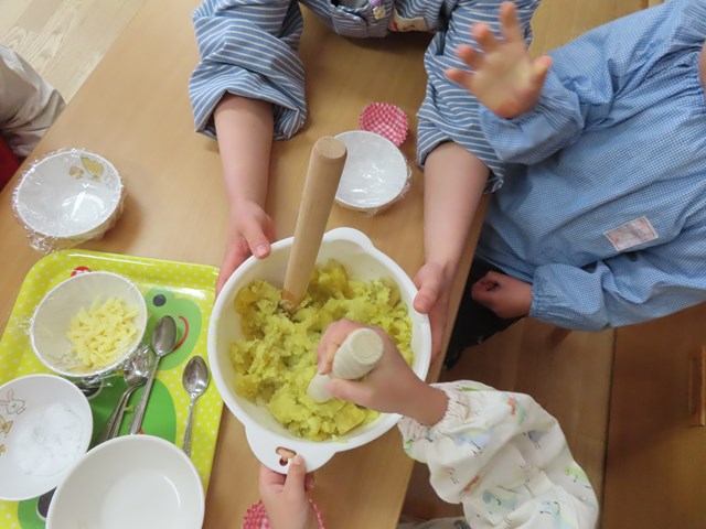 ホクホクにふかしたお芋をみんなで潰す時には、お互いにボウルを押さえ合いながら。