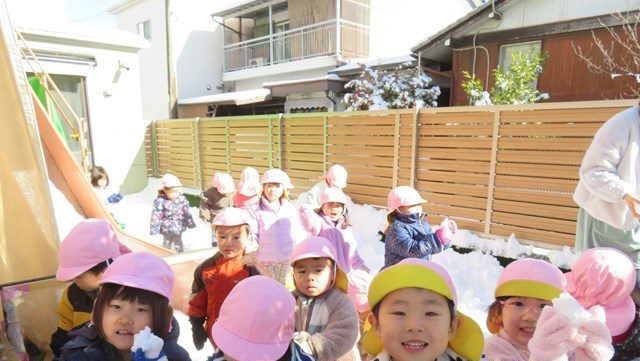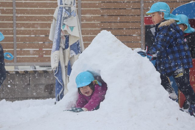 でも、園庭では子どもたちも先生たちも、みんなでかまくら作り、雪合戦、雪だるまづくり、・・・!