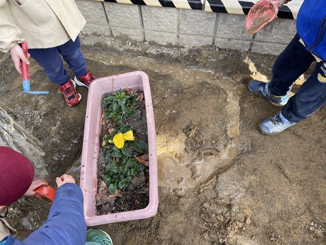 園庭の桜の木の周辺に、なんと小川が出来ていました😲