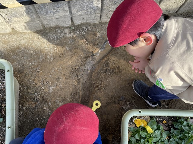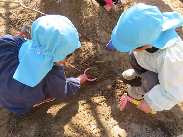 園庭の砂場ランドでいつものように子ども達が掘っていると、1本の根っこがびよ~んと出てきました。